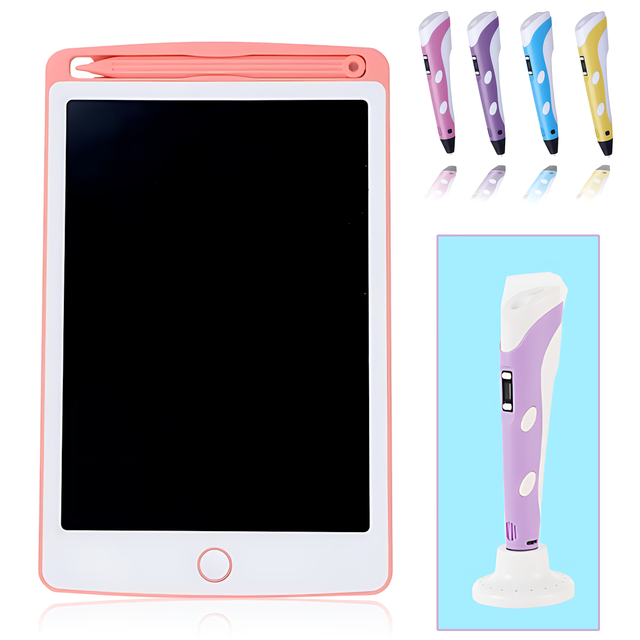 В комплекте идёт 100 метров PLA-пластика, трафареты, защитные аксессуары и отдельный планшет для рисования 8,5", который работает от батарейки и позволяет стирать изображение одним нажатием кнопки.