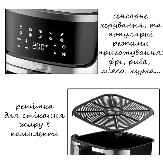 Аэро гриль фритюрница RAF R.5395, 9 л, 1950 Вт, сенсорный экран, таймер 60 мин, нержавеющая сталь