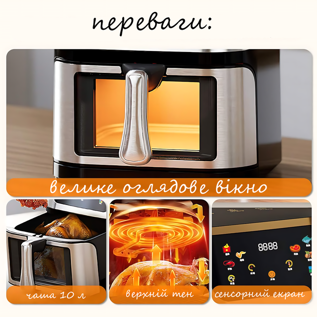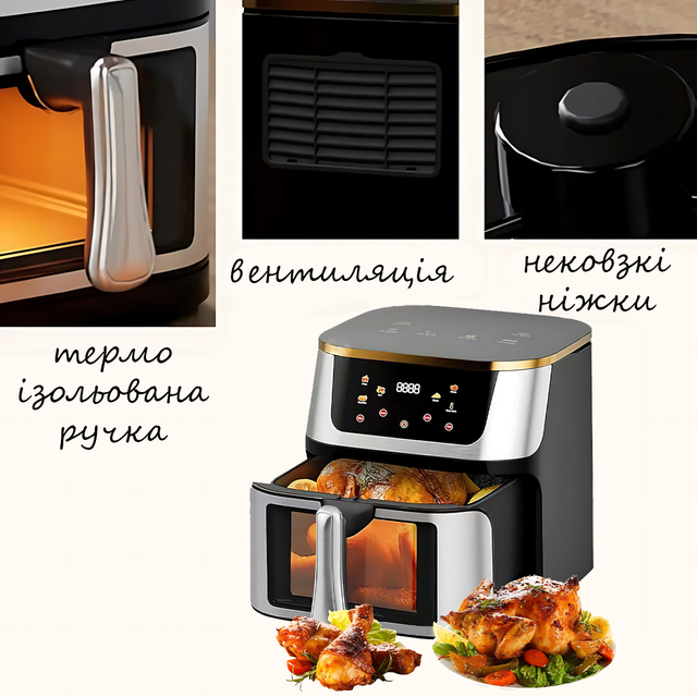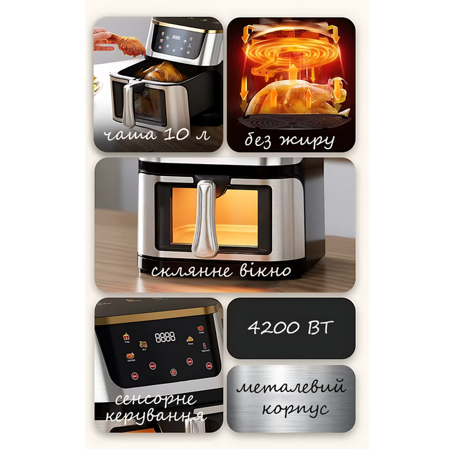 Аэрофритюрница Top Kitchen TK 00247, 4200 Вт, 10 л — мощный мультигриль для готовки без масла, сенсорное управление, 6 программ, 360° горячий воздух