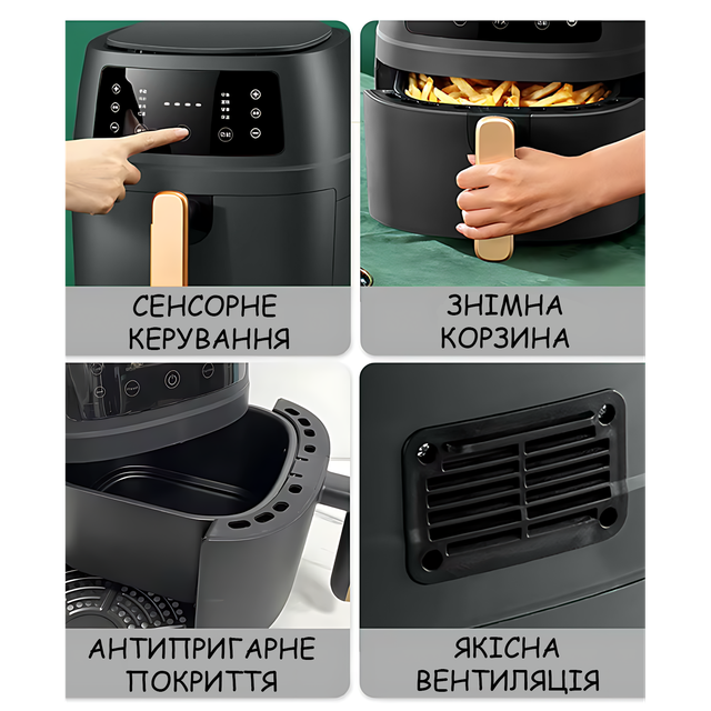 Корзина с антипригарным покритием легко вынимается і миється в посудомийній машині, а чёрный термостойкий корпус не нагревается снаружи і стильно виглядає на кухні.