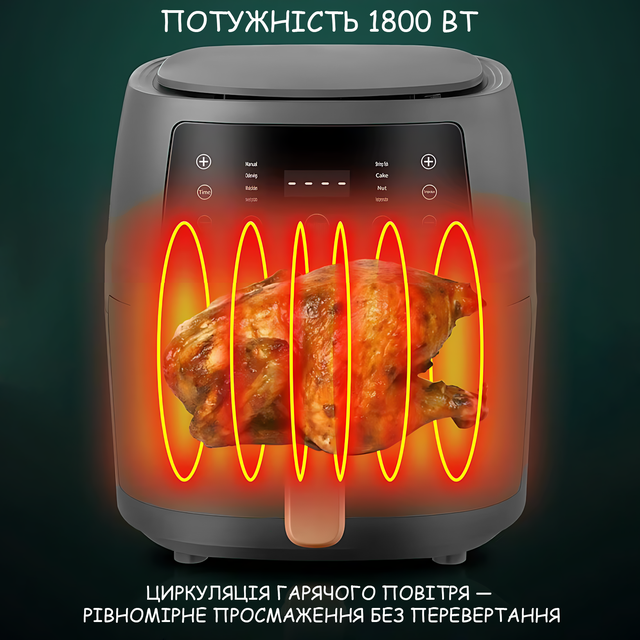 Мощность 1800 Вт обеспечивает быстрое нагревание и равномерную циркуляцию горячего воздуха, а сенсорное управление и LED-дисплей делают процесс максимально удобным и понятным.