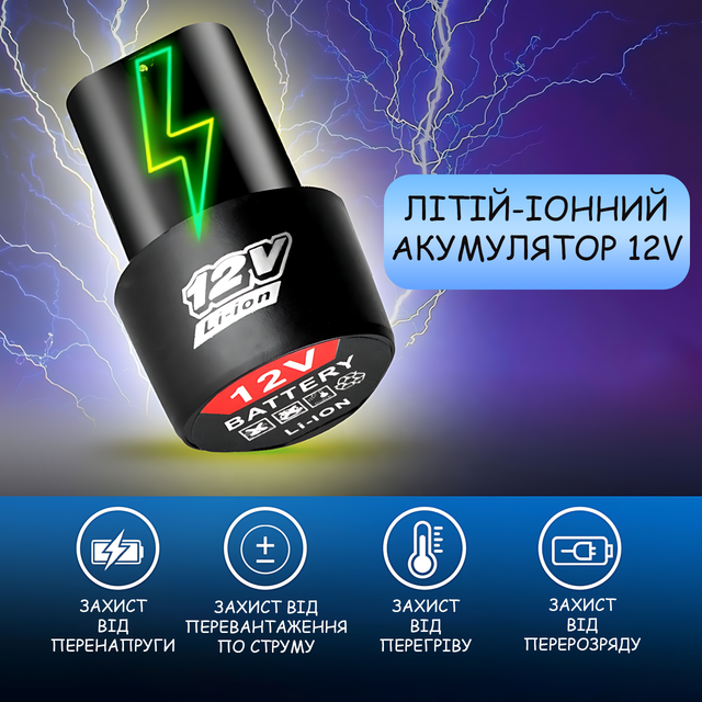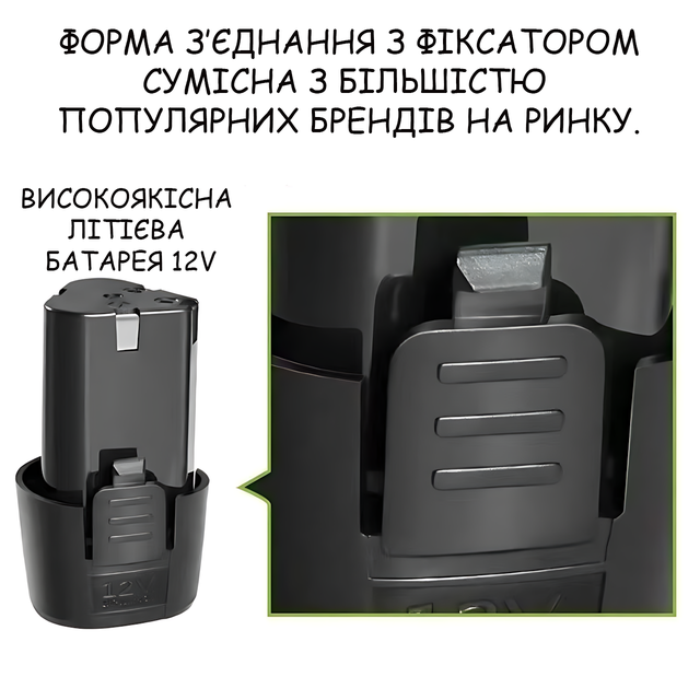 - ✅ Совместим с большинством 12V инструментов (шуруповёрты, дрели, болгарки)