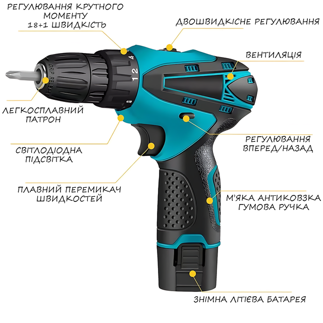 - Аккумулятор (литий-ионный): 12V/2.0Ah;