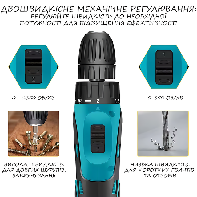 - 2-х скоростной планетарный редуктор с металлическими шестернями: Редуктор с металлическими шестернями обеспечивает прочность и долговечность конструкции. Металлические детали значительно уменьшают износ инструмента при интенсивной эксплуатации, позволяя шуруповёрту работать стабильно на двух скоростях – до 350 об/мин и до 1300 об/мин;