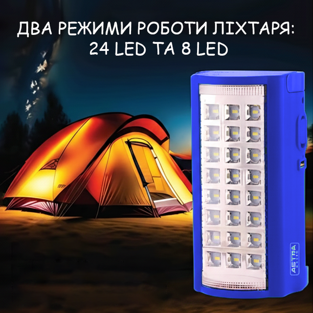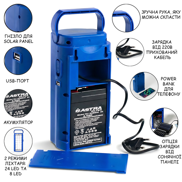 Аккумуляторный светодиодный фонарь Astra Silver RD-24 — 24 LED, 80 Вт, 6V/4000 mAh, работа до 80 часов, 2 режима, встроенная зарядка 110–240V, USB-порт, возможность зарядки от солнечной панели 9V, переносная ручка, синий
