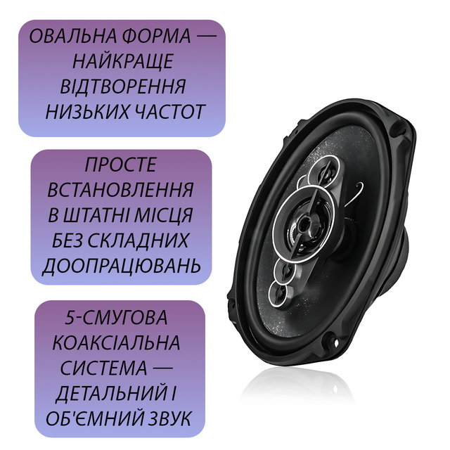Автоакустика TS-6996 6×9″ (16×24 см), 5-полосные коаксиальные динамики, 650 Вт max / 120 Вт RMS, 4 Ом, 92 дБ, 30–36000 Гц, овальные автомобильные колонки, комплект 2 шт
