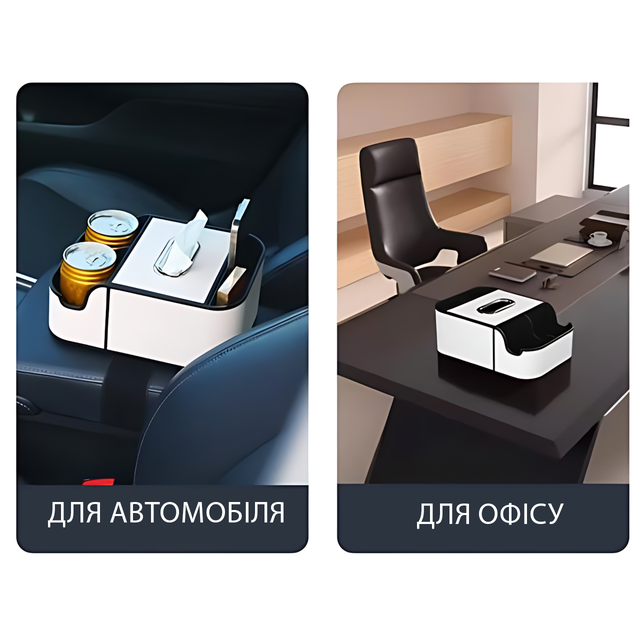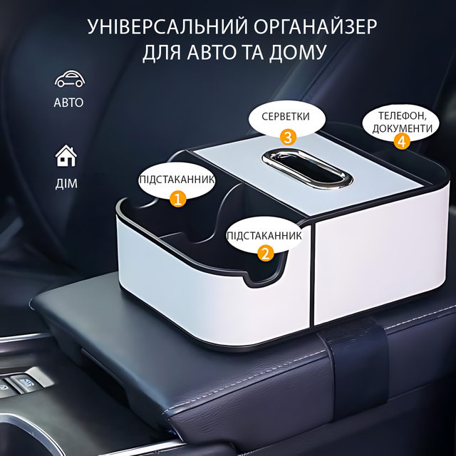 Стильный, компактный и продуманный до мелочей. Просто вставь его между сиденьями - и вуаля! - место для всего нашлось. 4 удобных отделения держат все на своих местах: смартфон, зарядку, салфетки, напитки, мелочи. А благодаря ремню и липучке он не скользит даже на крутых виражах.