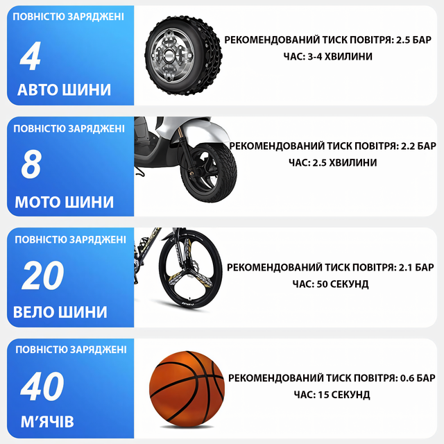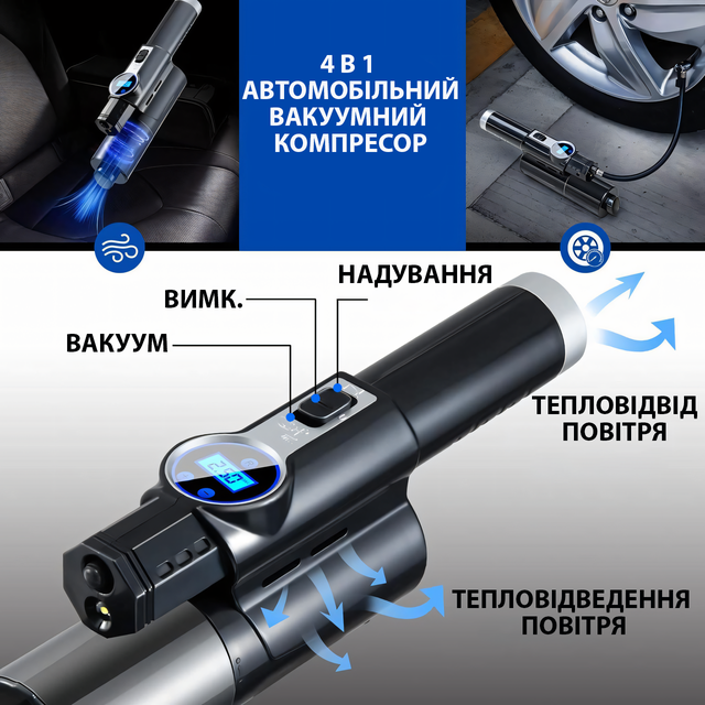 - Многофункциональный: Используется для очистки и накачивания шин;