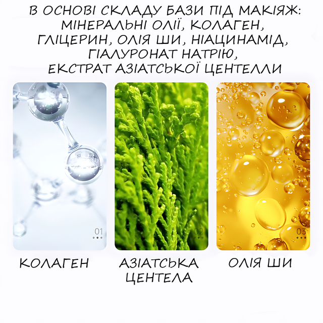 - Увлажнение и питание кожи: Благодаря маслу Ши, гиалуроновой кислоте и коллагену, база глубоко увлажняет кожу, восстанавливая её естественный водный баланс и улучшая эластичность. Масло Ши укрепляет кожный барьер, устраняя раздражение и предотвращая сухость;