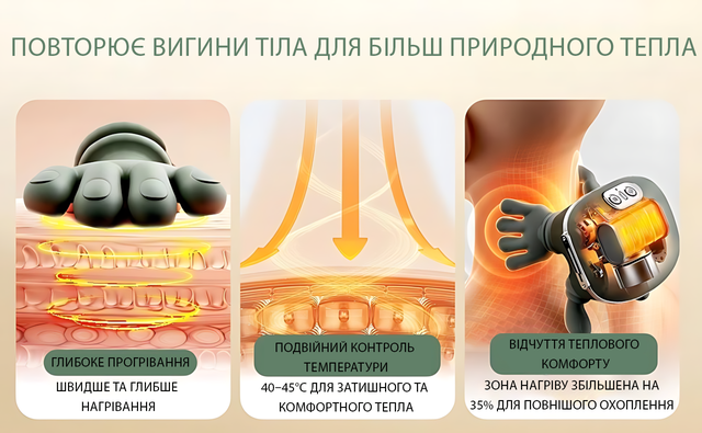 Двухзонный подогрев с двумя уровнями температуры (40–43 °C) усиливает эффект в разы. Это не «горячо», а именно тепло, которое расслабляет, улучшает кровообращение и помогает телу быстрее прийти в себя. Тепло распределяется естественно, повторяя контуры тела — без перегрева и неприятных сюрпризов.