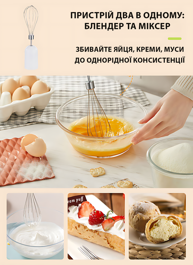 - Формат 4-в-1: венчик, блендер, измельчитель и мерный стакан - все, что нужно, уже в комплекте.