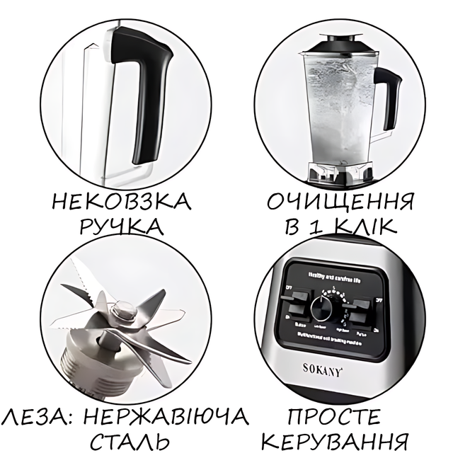 Блендер SOKANY SK-999 — это мощный и надежный помощник на вашей кухне, который станет незаменимым для приготовления различных блюд и напитков. С его помощью вы легко справитесь с любыми задачами, от приготовления смузи и коктейлей до измельчения овощей и фруктов.