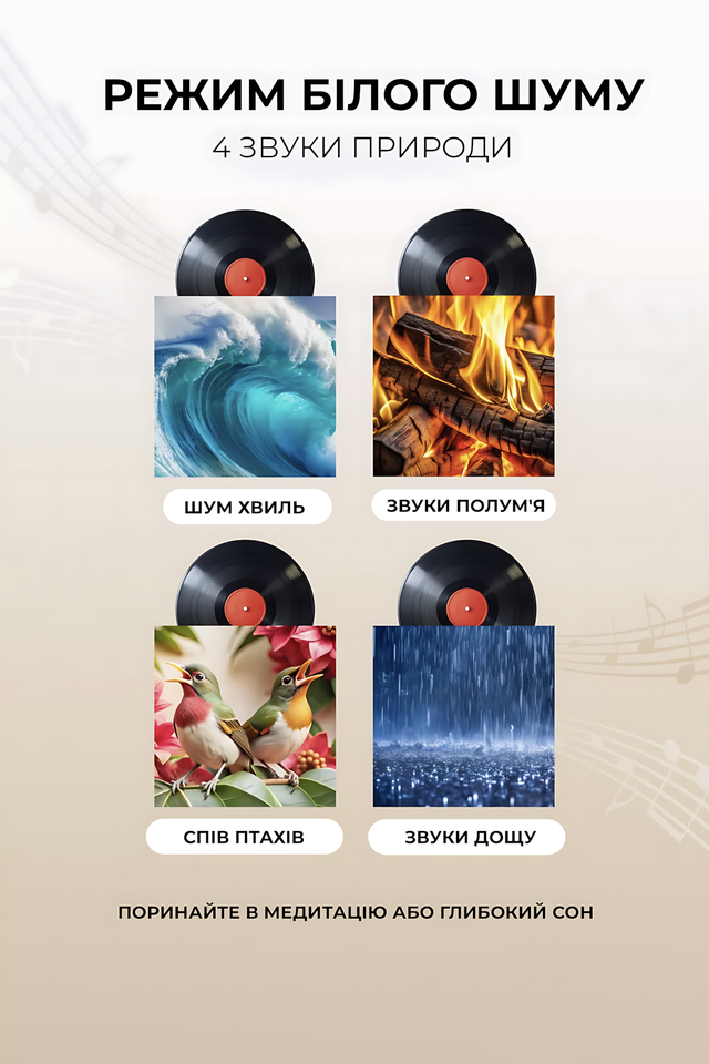 - Встроенные звуки природы и белого шума — для сна и концентрации.