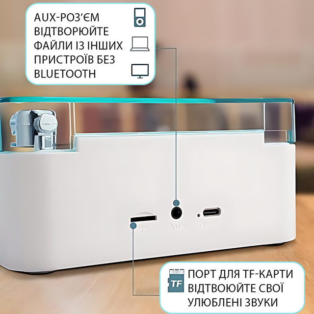 Снаружи — стильный ретро-проигрыватель. Внутри — Bluetooth колонка + ночник с «живой» водной проекцией, часы + генератор белого шума. Одним движением ты создаёшь атмосферу... мягкий свет, морская волна на столе и музыка, которая льётся без проводов. Да, романтика как она есть.