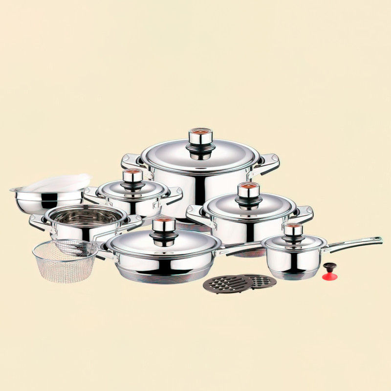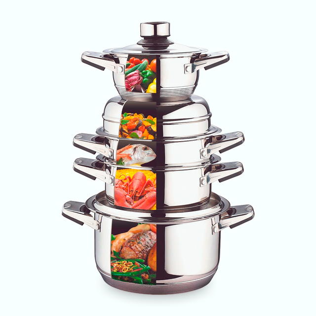 Набор посуды от Zepter International Germany содержит в себе все необходимые кухонные предмет, которые могут понадобиться в быту, от различных кастрюль и сковородок до подставок под горячее и корзин для фритюра. Фирма Zepter - это передовой производитель на рынке посуды и товаров для быта, который использует только передовые технологии и качественные материалы. Данный набор выполнен из более 50-ти различных элементов, ферритных, хирургических сталей, хрома, никеля и других. Все эти компоненты помогают равномерно распределять тепло по всей площади посуды, а также обеспечить долговечность, легкую очистку и удобность эксплуатации.