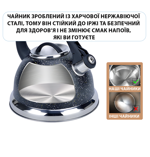 - ✔ Гранитное покрытие – не только украшает чайник, но и повышает его устойчивость к царапинам.