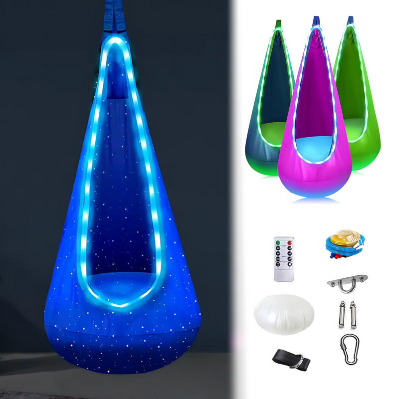Это не кресло! Это кокон спокойствия. В котором ребёнок может читать, играть, мечтать, раскачиваться. Или же просто залипать в мягком свете LED-подсветки.