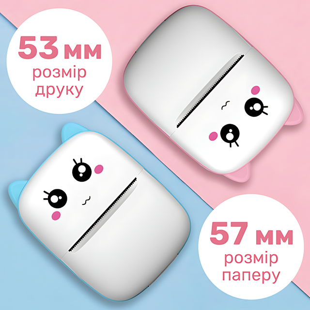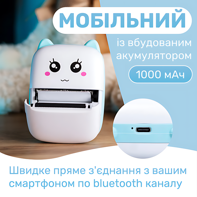 Яркий дизайн с «ушками» понравится каждому ребёнку, а благодаря встроенному аккумулятору на 1000 мАч принтер можно брать с собой куда угодно: в школу, в дорогу, в кафе или к бабушке.