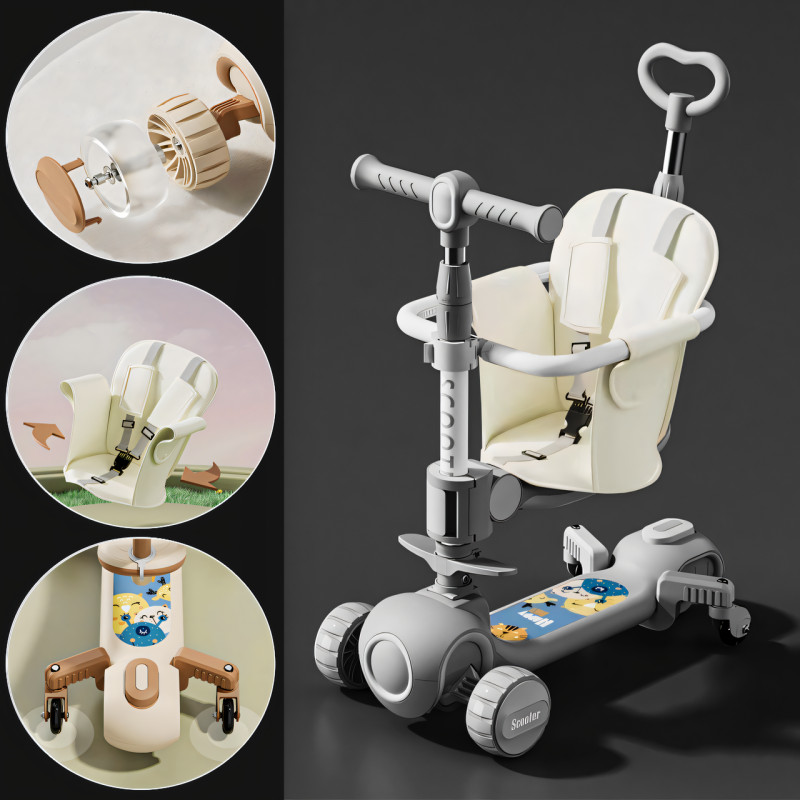 Детский самокат DD-V1 с сидением и родительской ручкой, многофункциональный, 4 колеса, от 1 до 12 лет