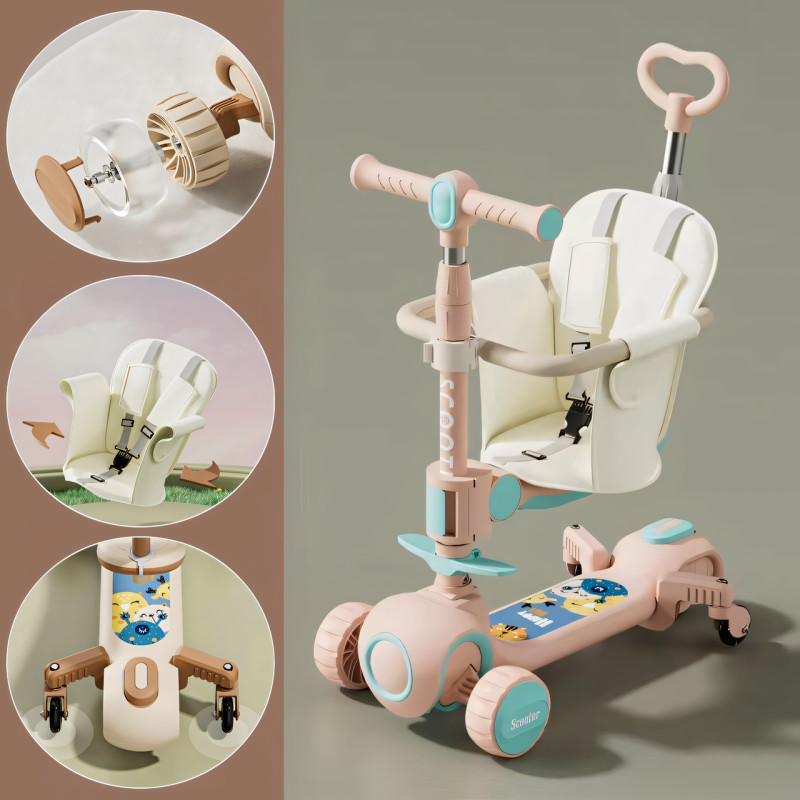Детский самокат DD-V1 с сидением и родительской ручкой, многофункциональный, 4 колеса, от 1 до 12 лет