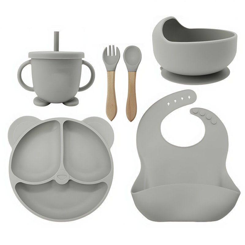 Детский силиконовый набор посуды 6 предметов: тарелка на присоске с 3 секциями Ø19 см, с ложкой и вилкой, чашкой-поилкой 150 мл Серый