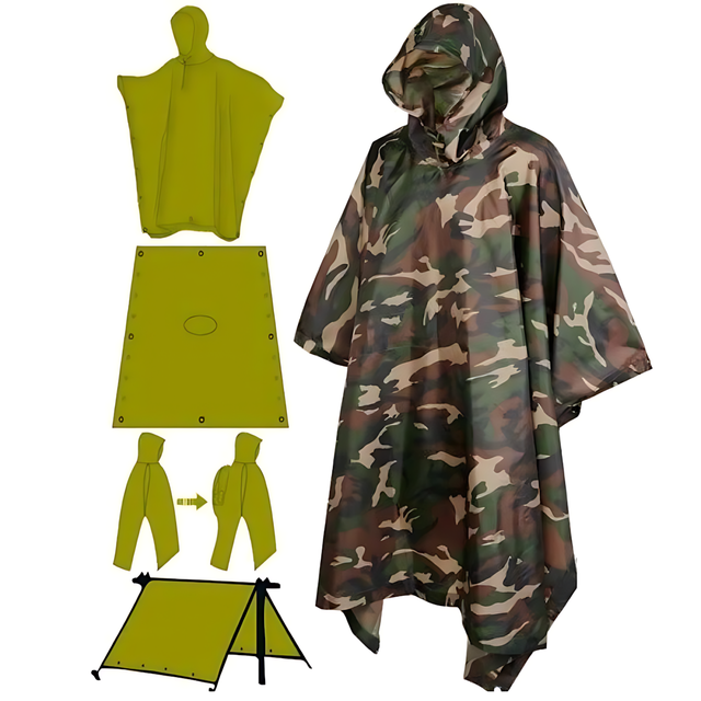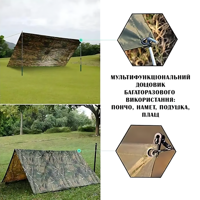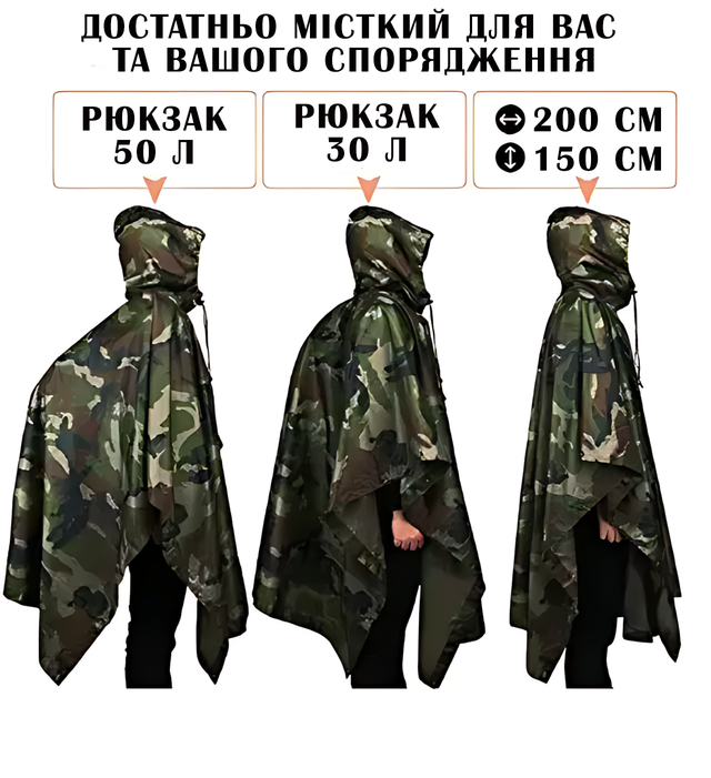 Дождевик Raincoat AND -1, накидка от дождя 3 в 1: плащ палатка пончо, 200 х 150 см, камуфляж