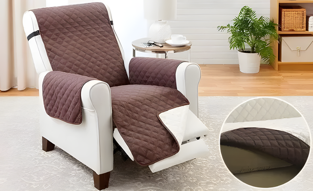 Стильный дизайн с обеих сторон – темно-коричневой и белой – позволяет вам выбирать подходящий вариант под ваш интерьер. Дополнительная длина покрывала учитывает подлокотники кресла, обеспечивая полную защиту от загрязнений.