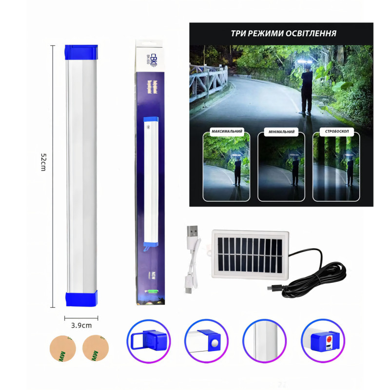 Диодная лампа Bailong BK-700T — это многофункциональный источник света длиной 72 см, идеально подходящий для кемпинга, аварийных ситуаций и работы. Она заряжается от солнечной панели, сети 220 В или через USB-устройства. Лампа работает до 10 часов, имеет три режима свечения и может крепиться на любую магнитную поверхность. Пластиковый корпус оснащен выдвижным крючком для удобного подвешивания.