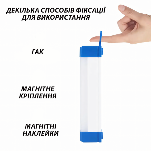 - Магнитное крепление: Лампа может быть установлена на любую магнитную поверхность, а также в комплекте идут две магнитные наклейки, которые можно приклеить в удобное место и закрепить лампу на магните. Это позволяет легко использовать лампу в различных условиях;