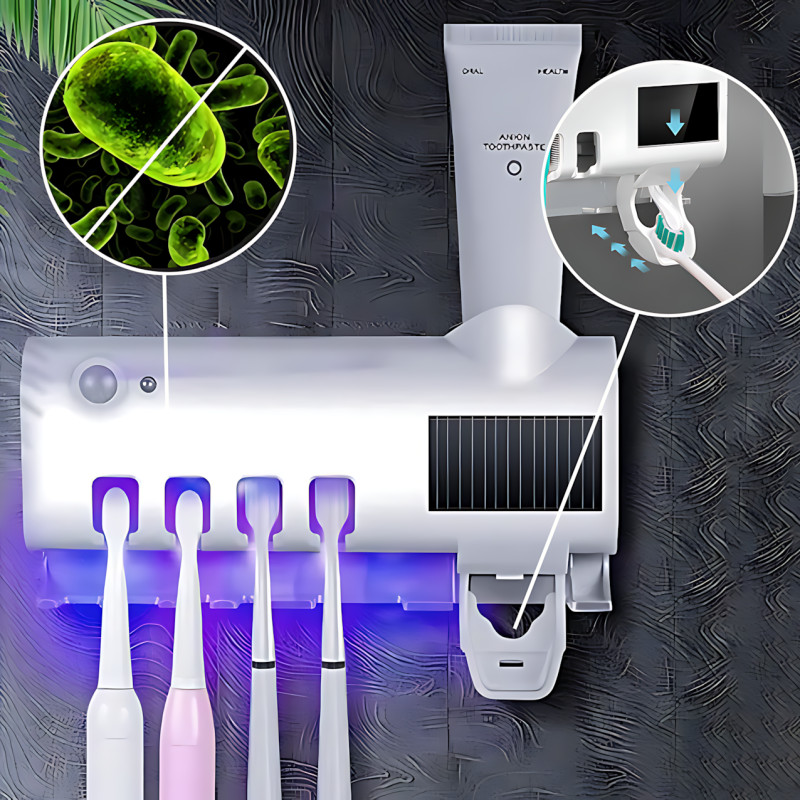 Автоматический диспенсер для зубной пасты и щеток с УФ-стерилизатором Toothbrush Sterilizer - это многофункциональное устройство, которое объединяет держатель для зубных щеток, ультрафиолетовый стерилизатор и механический дозатор зубной пасты. Ультрафиолетовая лампа эффективно уничтожает до 99,99% болезнетворных микроорганизмов, остающихся на щетинках зубных щеток после использования. Устройство оснащено встроенным литиевым аккумулятором на 1500 мАч и поддерживает зарядку через USB, обеспечивая удобное и долгосрочное использование.