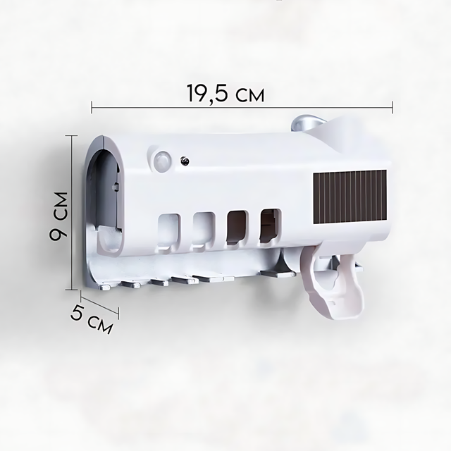 - Многофункциональность: Устройство объединяет держатель для щеток, УФ-стерилизатор и дозатор зубной пасты, что экономит место в ванной комнате;