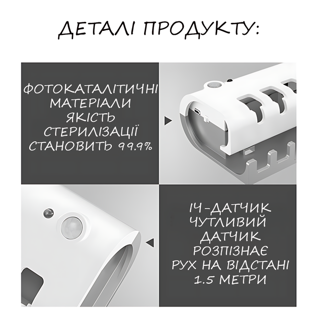 - Безопасность: Встроенный магнитный датчик автоматически включает УФ-лампу, только когда на расстоянии 2 метров нет движения, что предотвращает случайное воздействие УФ-излучения;