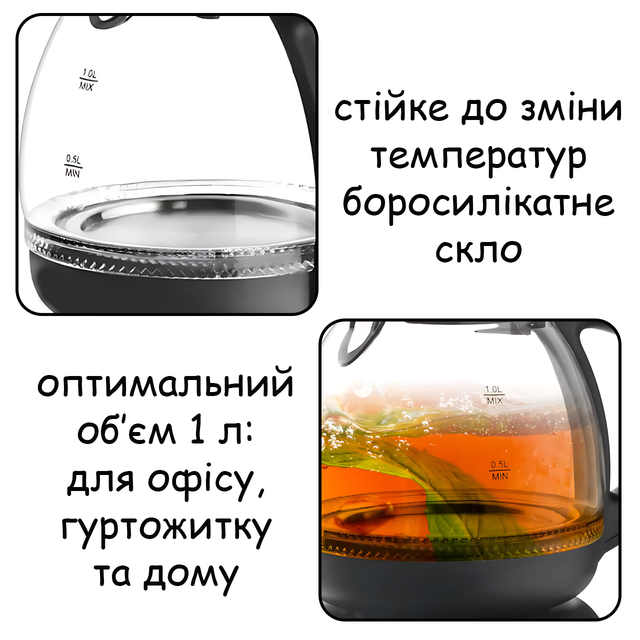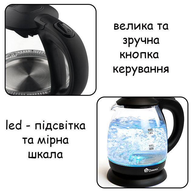 Электрочайник Domotec MS-7910 1 л, 1650 Вт, стеклянный корпус с LED-подсветкой, автоотключение, защита от перегрева, поворотная база 360°, черный