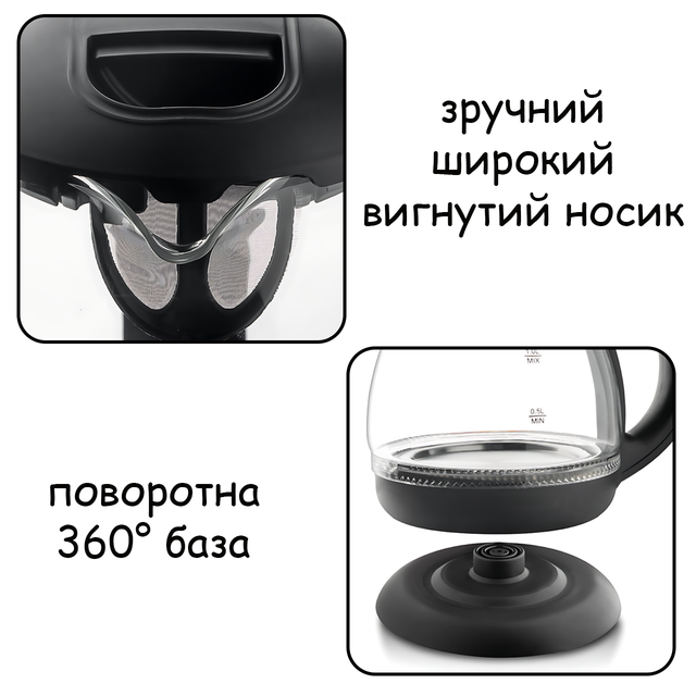 Электрочайник Domotec MS-7910 1 л, 1650 Вт, стеклянный корпус с LED-подсветкой, автоотключение, поворотная база 360°, черный