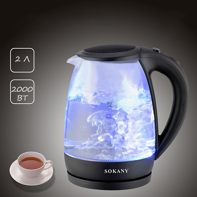 Электрочайник SOKANY SK-601 со скрытым тэном, стеклянным корпусом с подсветкой, шкалой уровня воды, 2000 Вт