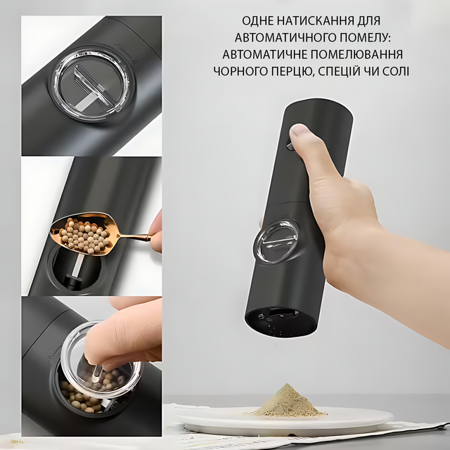 Больше никаких кручений! Просто нажми кнопку, и...свеже-молотые специи польются в тарелку. Одна рука свободна? Отлично! Именно ей ты и управляешь этим чудом. Перец, морская соль, кориандр — всё "по щелчку".