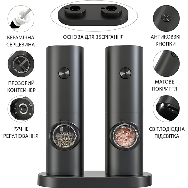 Электрическая мельница для соли и перца 2 в 1 с подсветкой и подставкой, регулировка помола, на батарейках