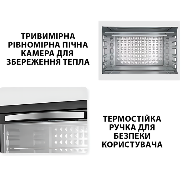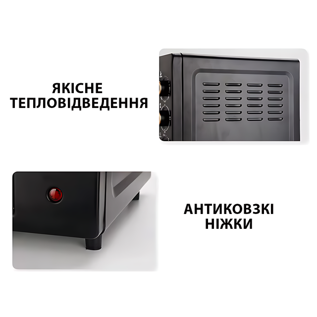 Ставьте ее куда угодно – на стол, полку, хоть на балкон (но лучше все-таки на кухню). Благодаря верхнему и нижнему нагревательным элементам блюда готовятся равномерно, а прозрачная дверца дает вам полный контроль над процессом – никакого пригоревшего ужина!