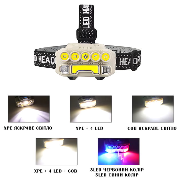 Фонарь налобный Bailong HX-817 с сенсором, Type-C и аккумулятором 18650, красным, синим и белым свечением