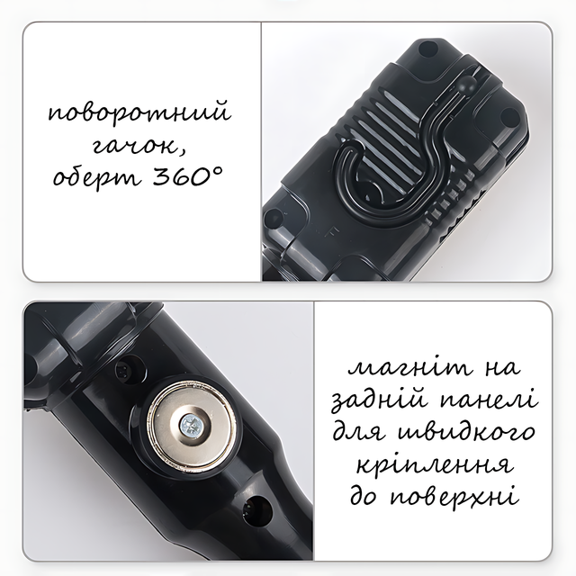 Сзади встроен мощный магнит, который надежно крепит лампу к любой металлической поверхности — руки остаются свободными. А сверху предусмотрен крючок, чтобы можно было подвесить фонарь над рабочей зоной.
