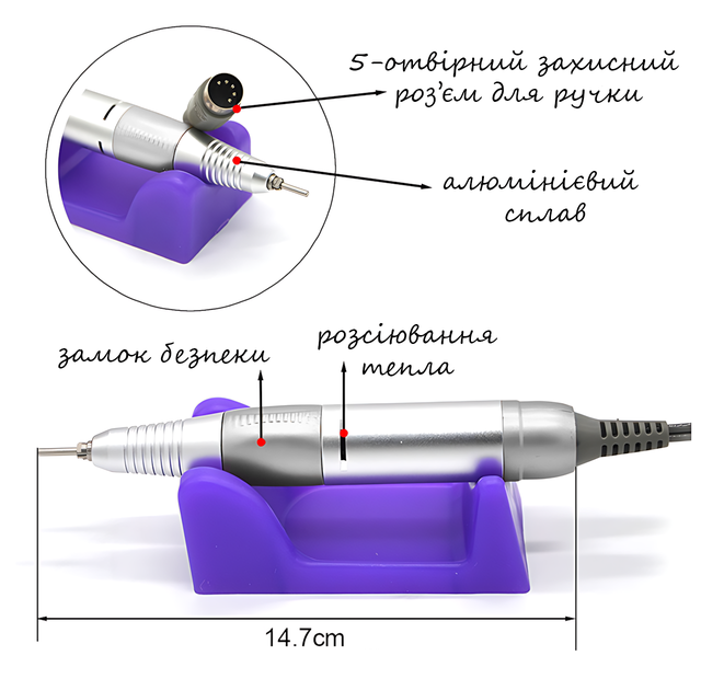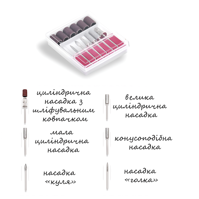 Универсальность? Да! Маникюр, педикюр, снятие гель-лака, шлифовка — он справляется со всем. А ещё в наборе есть насадки: алмазные фрезы и колпачки, так что можно работать сразу после распаковки.
