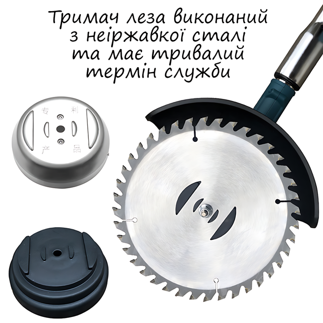 - Комплект насадок: В комплекте идут 14 насадок, включая пластиковые и металлические лезвия, а также пильный диск, что делает газонокосилку многофункциональной;