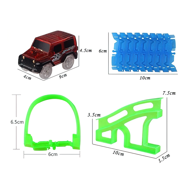Игровые машинки с кнопками включения, расположенными удобно сверху, добавляют динамику и веселье в гоночные состязания. Особенно впечатляющий эффект достигается благодаря светящимся в темноте деталям трассы, создавая магическую атмосферу во время заездов в ночное время.