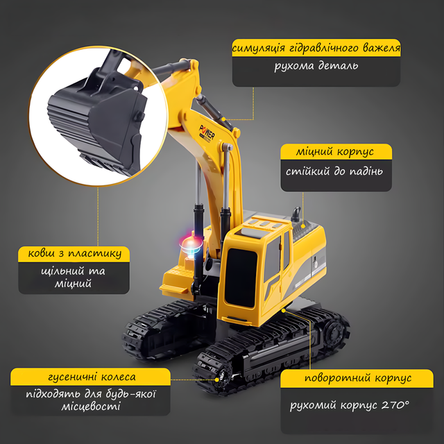 - Функциональные возможности: Экскаватор оснащен реалистичными функциями, такими как вращение стрелы, подъем и опускание ковша, что позволяет детям погрузиться в игру;