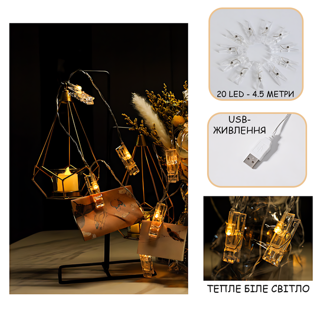 Гирлянда-прищепки LU999, 4.5 м, 20 LED, тёплый белый свет, USB/батарейки, для фото и декора, декоративная подсветка