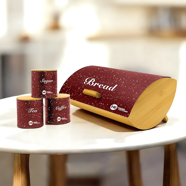 Хлебница из бамбука и металла Higher Zepline ZP-042 + 3 баночки для сыпучих продуктов, красный