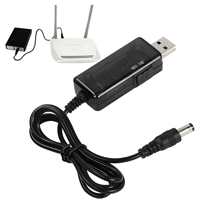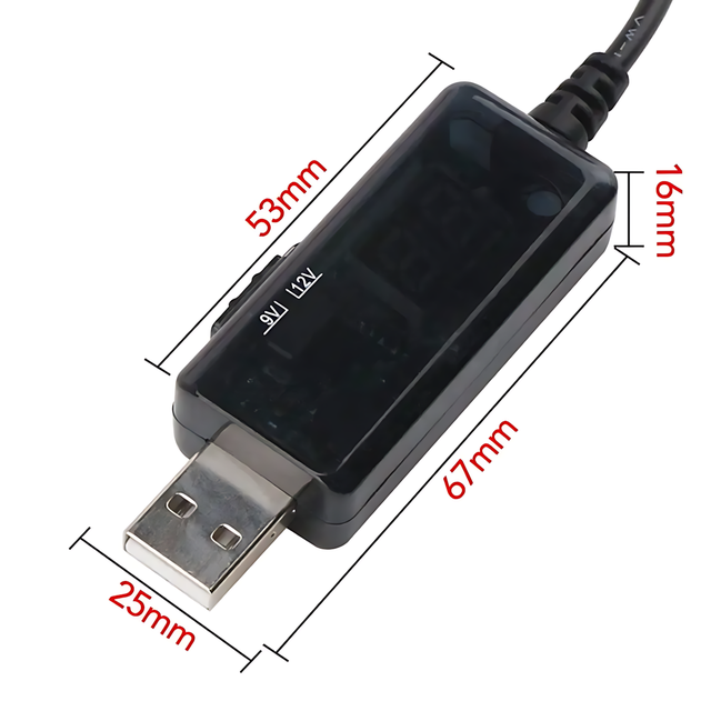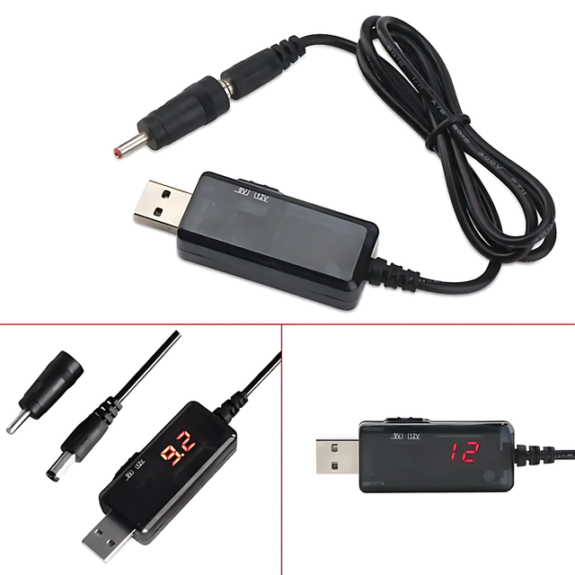 Повышающий преобразователь USB постоянного тока в 9 В или 12 В с кабелем и разъемом 3,5x1,35 мм предназначен для питания или зарядки различных устройств от источника с USB-выходом. Этот кабель может быть использован для обеспечения работы устройств, требующих более высокого напряжения, чем стандартный 5 В, таких как роутеры, лампы или маленькие вентиляторы.