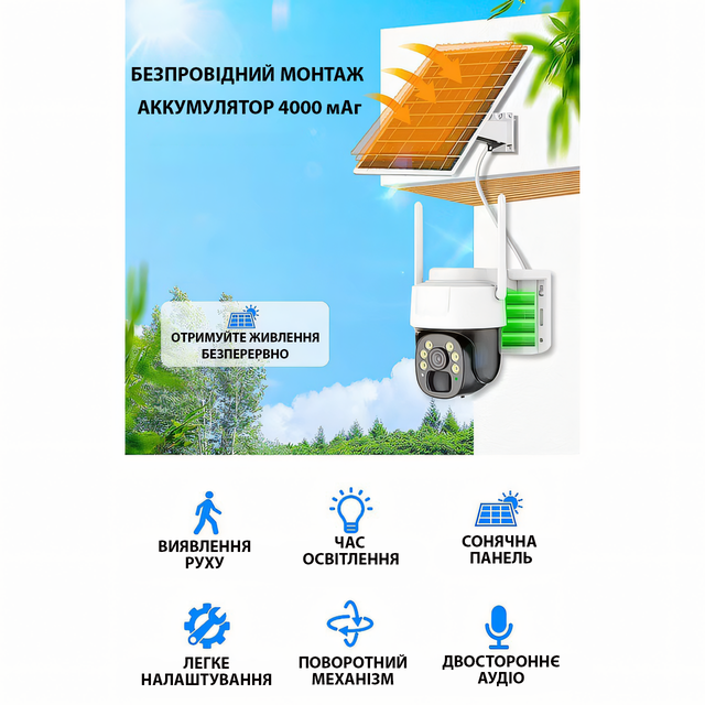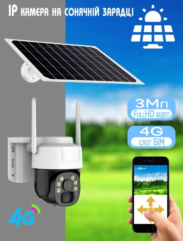 Камера оснащена встроенным аккумулятором, который заряжается от солнечной панели, обеспечивая полную автономность.