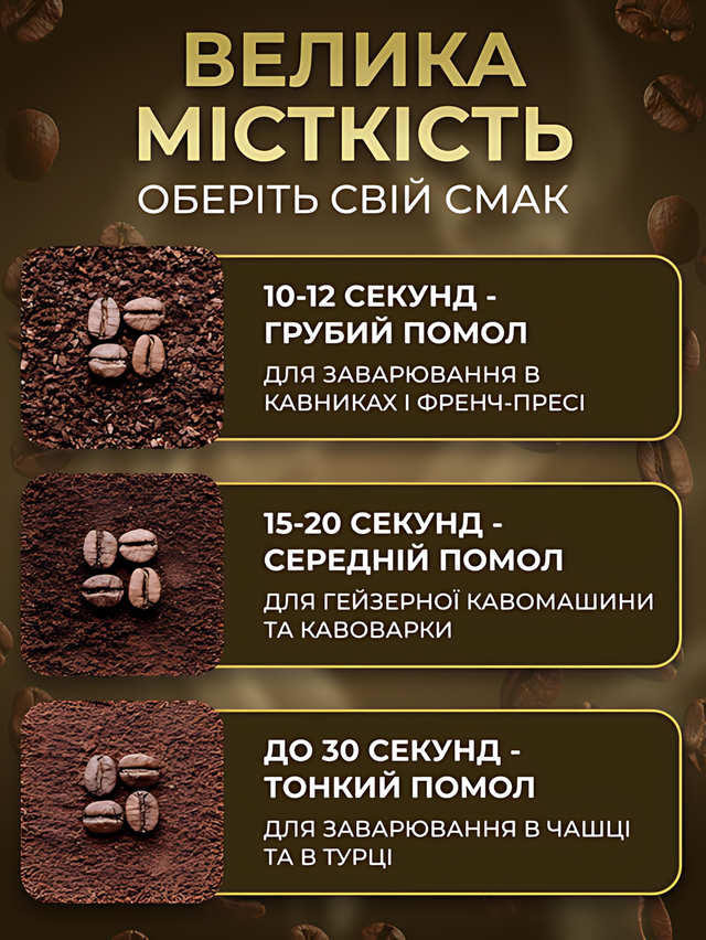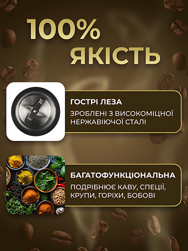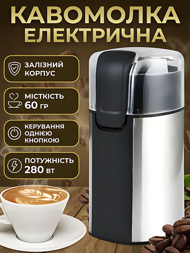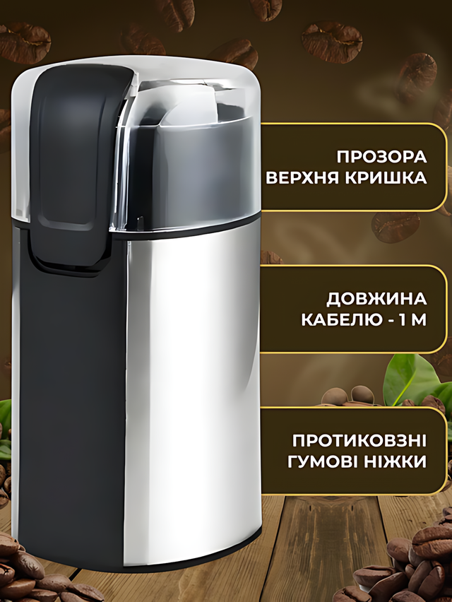 Благодаря мощному мотору (280–300 Вт) и острым ножам из нержавеющей стали, кофемолка обеспечивает быстрый и равномерный результат. В ёмкость помещается до 60 г зерен — достаточно для приготовления нескольких порций ароматного кофе для всей семьи.