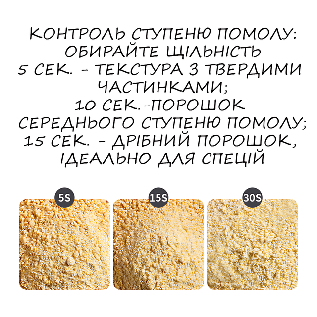 - Регулируемая степень измельчения: Возможность регулировки толщины измельчения в зависимости от времени работы (5 секунд — грубое измельчение, 15 секунд — среднее, 30 секунд — мелкое);